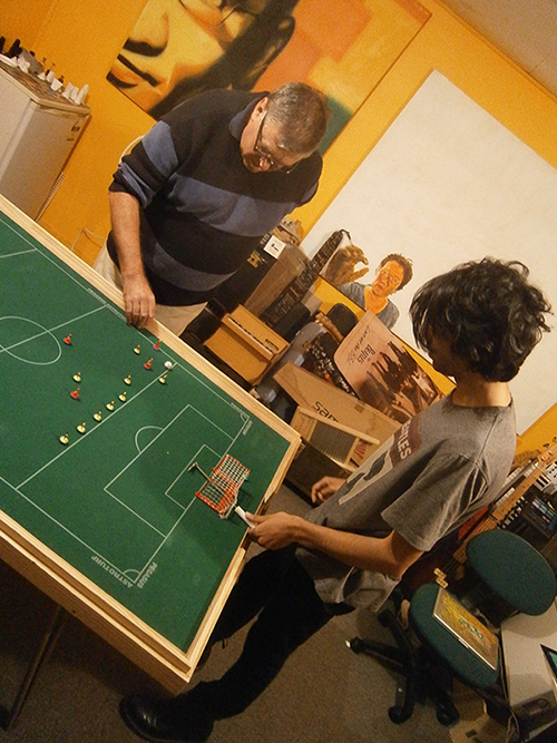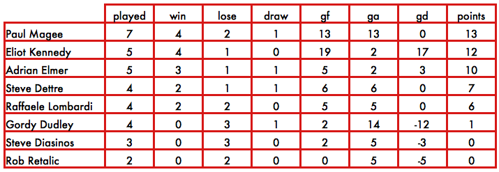 With Eliot’s earlier result putting him in prime position, both players knew the result of this game could go a long way to deciding the league winner and so the game was played with appropriate intensity. Much of the game took place in the middle two quarters of the pitch with neither able to wrestle control of the match from the other. And by half time, the scoreline reflected this evenness with each player having scored a goal from the relatively few chances they each had. A highlight was the half chances that each player was able to turn into actual shots on goal through their precise flicking skills. The second half remained a tense affair, though Eliot began to exert a small level of dominance. 5 minutes in and he regained the lead he had established earlier with a well taken finish. As Steve pressed, the game opened up and both players were able to carve out some more chances. It was Eliot who was able to make these count more and he scored his 3rd with a few minutes remaining. Steve continued to push and the tension never really left the game until the final whistle.