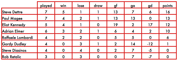 As we really close in on the pointy end of the season, Steve Dettre has made his statement and heads to the top of the table. However, he has also played out all his games, meaning 4 points from his last two games will be enough for Eliot to take the title with his ludicrous goal difference. The battle for 3rd and 4th spots will go down to the wire, with Paul still clinging in there, while Raffaele and Adrian’s final few results will be extremely telling. Gordy, Rob and Steve Diasinos will make up their games over the next few weeks, including matches against each other, meaning that points will be picked up as they chase the pack.